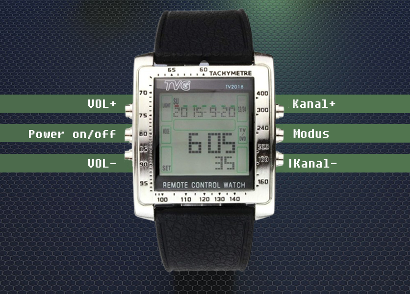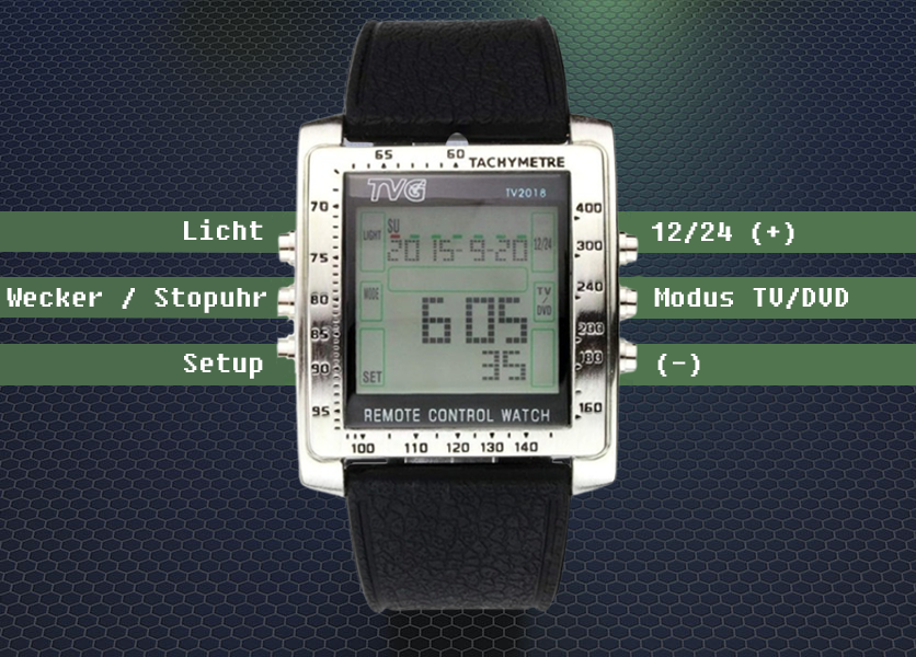 Mit dieser Uhr kannst du über 250 TV/SAT/DVD/VCR und andere HiFi Geräte steuern. Jeder hersteller hat eigene Codes.